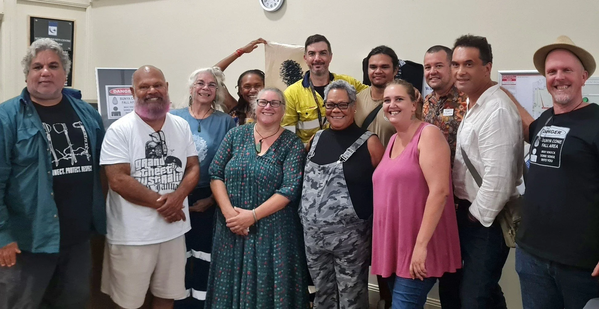 Left to Right: Jason Murphy (Jinibara), Uncle Colin Ross (Jinibara), Aunty Zeitha Jalamala (Jinibara), Gabrielle Quakawoot, Karen Shaw, Kaleb Murphy (Jinibara), Aunty Rhonda Sandow (Jinibara), Adrian Bauwens (Wakka Wakka), Brianna Asher (Kabi Kabi), Tom Esperanso, Mita Harris (Aotearoa), Spencer Shaw.