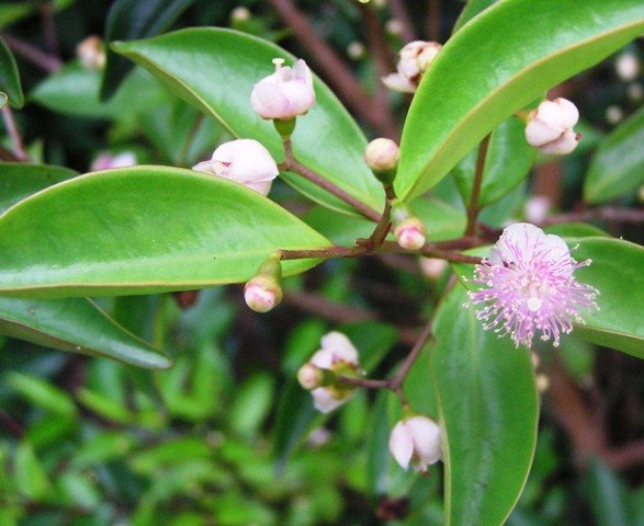 | flowering shrubs | Archirhodomyrtus beckleri | Rose Myrtle | Bushy myrtle shrub 3-6m. Delicate pink-white flowers, edible orange fruit eaten by birds. Reasonably hardy and useful screen plant, but fairly slow. Sun or semi-shade. | ![]() |